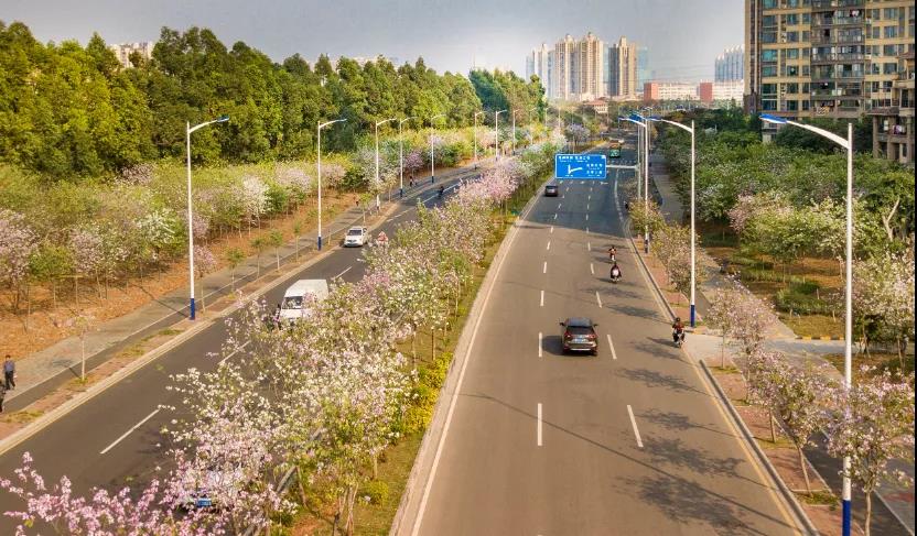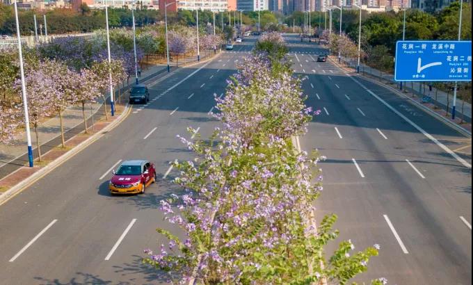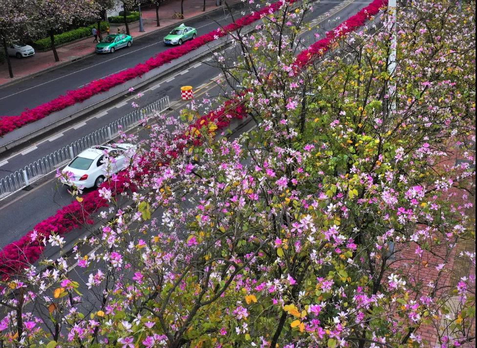 车在花海行,人在画中游。走在人民北路流花湖公园路段,给人印象最深就是这两句话、8个字。这一带的紫荆花开得正艳,粉色、红色、白色的紫荆花竞相争艳,当风来时,花朵随风摇曳,恰似翩翩飞舞的蝴蝶,加上高架桥的簕杜鹃和黄的、绿的树叶,是花海,也像一幅油画。