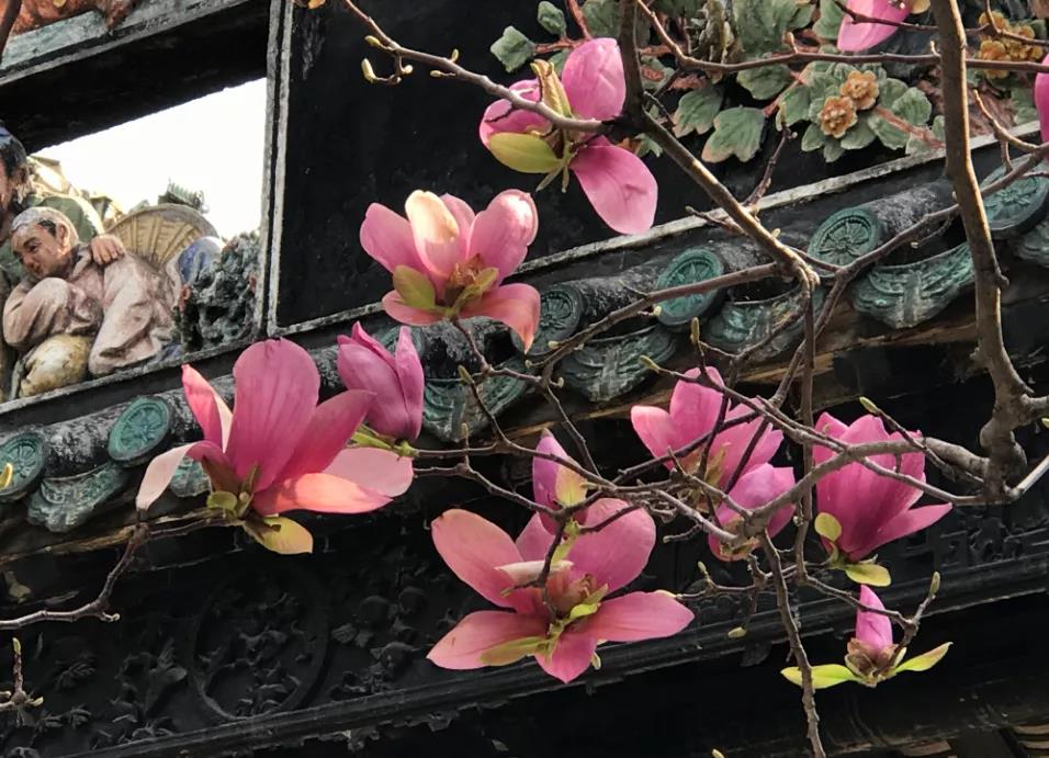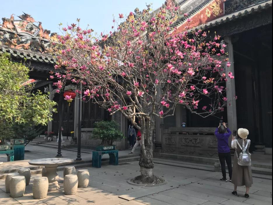 满树花枝招展爬上梁顶古瓦 密集紫色花朵在古瓦飞檐前怒放 引得各种鸟儿竞相栖息鸣唱对歌 玉堂春花为陈家祠披上春天的新装