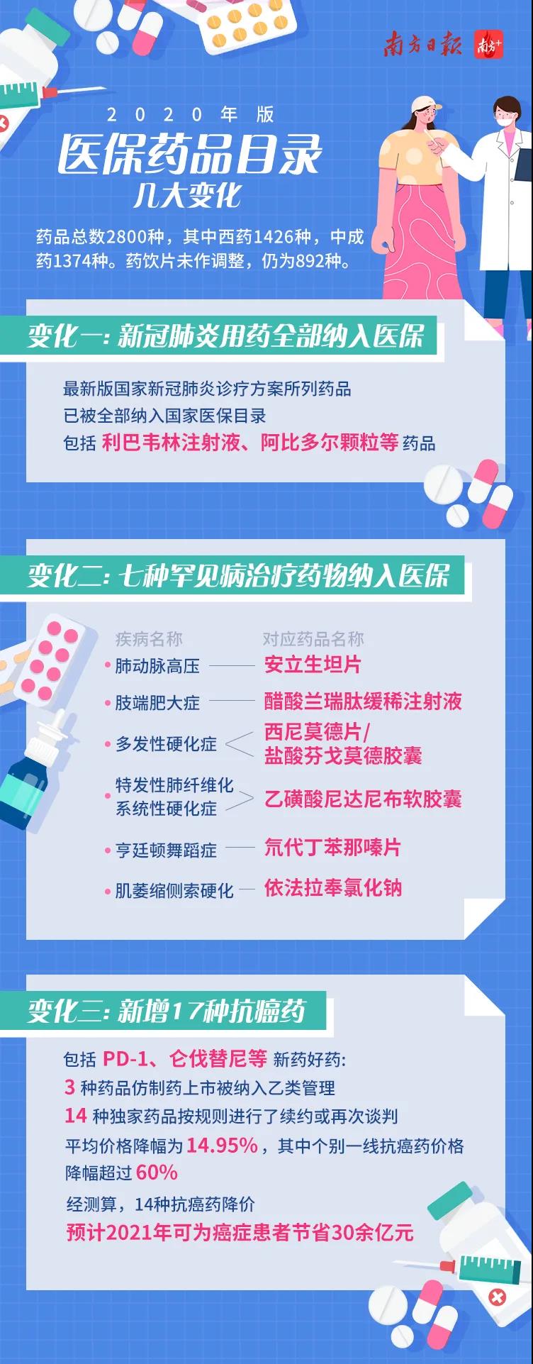 | 3月1日起,广东正式启用新版医保药品目录。这一次,最新版国家新冠肺炎诊疗方案所列药品和221个国家谈判药品全部纳入我省医保支付范围,助力新冠肺炎疫情防控。 2020年12月28日,备受关注的《国家基本医疗保险、工伤保险和生育保险药品目录(2020年)》正式出台。经过本次目录调整,119种药品被调入目录,29种药品被调出目录,最终目录内共计2800种药品,其中西药1426种,中成药1374种,中西药比例基本持平。 新版医保药品目录比去年新增了17种抗癌药,包括PD-1、仑伐替尼等新药好药,2018年国家谈判的抗癌药中14种独家药品进一步降价,平均降幅为14.95%,个别抗癌药降幅超过60%。目前广东参保患者癌症用药的保障水平明显提升。 七种罕见病治疗药物纳入医保药品目录。我国约有2000万罕见病患者,目前绝大多数罕见病对症治疗药品已在医保药品目录中,将进一步减少患者经济负担。 医保药品目录连续三年调整,用药层次更加丰富。以治疗肿瘤药物为例,过去多是传统化疗药物,经过调整后,创新靶向药物、肿瘤免疫药物纳入医保,其中包括7种靶向药物,如奥希替尼、卡瑞利珠单抗等。 本次医保药品目录调整,对医保基金和患者负担的影响如何? 2020年底,国家医疗保障局称,新增的119种药品,多数是经过谈判实现降价的独家药品,预计2021年增加的基金支出,与谈判和调出药品所腾出的空间基本相当。从患者负担情况看,通过谈判降价和医保报销,预计2021年可累计为患者减负约280亿元。 2月底,广东医疗保障局发布通知,各地要严格执行《药品目录》,不得自行制定目录或用变通的方法增加目录内药品,不得对《药品目录》内的药品商品名进行限制,也不得自行调整目录内药品的限定支付范围。国家谈判药品执行全国统一的医保支付标准。同时,各地要及时将《药品目录》内药品按相关规定纳入当地药品集中采购范围,保障药品供应。