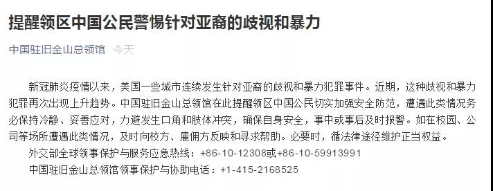 白宫新闻发言人:拜登总统对此表示谴责,并将致力于打击针对亚裔的仇恨行为。 普萨基称,白宫高级官员就此问题于当地时间4日与相关群体代表举行了线上圆桌会议。普萨基重申,联邦政府将与亚裔美国人群体合作,收集针对亚裔的仇恨犯罪数据信息,以便更好地解决并预防针对亚裔的仇恨问题。 番外 提醒领区中国公民警惕针对亚裔的歧视和暴力 新冠肺炎疫情以来,美国一些城市连续发生针对亚裔的歧视和暴力犯罪事件。近期,这种歧视和暴力犯罪再次出现上升趋势。中国驻旧金山总领馆在此提醒领区中国公民切实加强安全防范,遭遇此类情况务必保持冷静、妥善应对,力避发生口角和肢体冲突,确保自身安全,事中或事后及时报警。如在校园、公司等场所遭遇此类情况,及时向校方、雇佣方反映和寻求帮助。必要时,循法律途径维护正当权益。 外交部全球领事保护与服务应急热线:+86-10-12308或+86-10-59913991 中国驻旧金山总领馆领事保护与协助电话:+1-415-2168525 中国驻旧金山使馆报道截图 来源于央视新闻客户端/殷岳、中国驻旧金山使馆、环球网,转载目的在于传递更多信息,并不代表本网站赞同其观点和对其真实性负责。如涉及作品内容、版权和其它问题,请在后台联系微信,我们将在第一时间删除内容! |