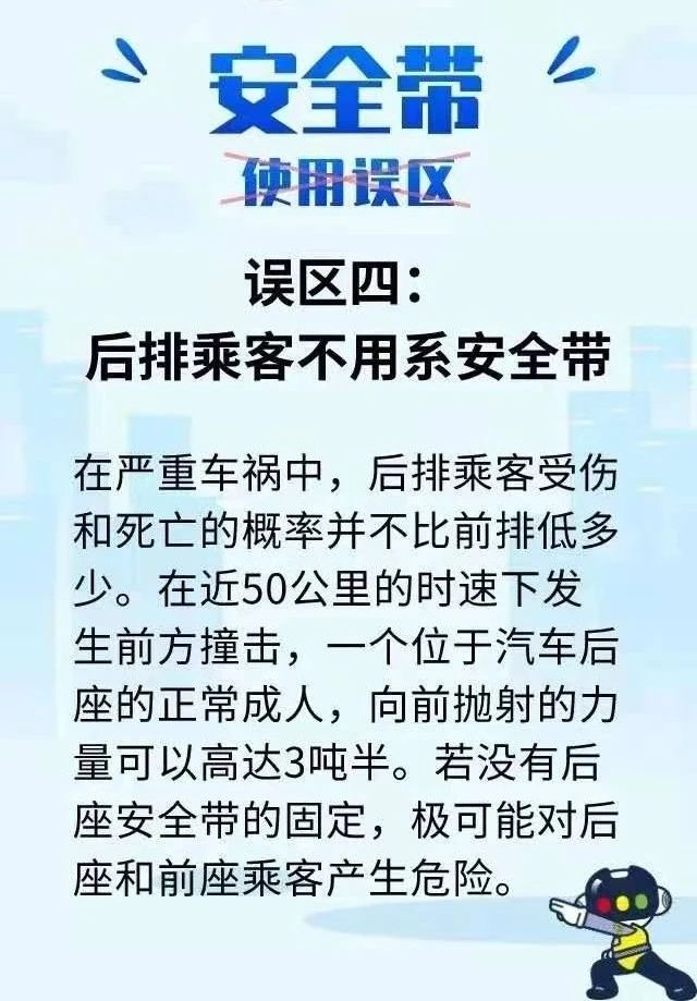 殊不知当车辆发生交通事故时,后排乘坐人如未系安全带,因没有安全气囊的缓冲和保护,可能会撞击到前排座椅、顶棚、前挡风玻璃、仪表台,甚至被直接甩出车外,严重威胁自身和前排驾乘人的生命安全。