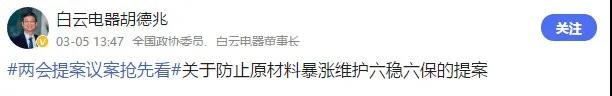 全国政协委员、白云电器董事长胡德兆发布#两会提案议案抢先看#关于防止原材料暴涨维护六稳六保的提案。(图片来源:南方财经)