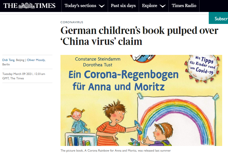 据报道,这本只有24页的德语少儿读物,书名直译为“给安娜和莫里茨的一道新冠彩虹”,以故事的形式提醒幼儿园及小学阶段适龄儿童在新冠肺炎疫情期间的注意事项。但该书在介绍新冠病毒时写道,“新冠病毒来自中国并从那里传播到全世界……”