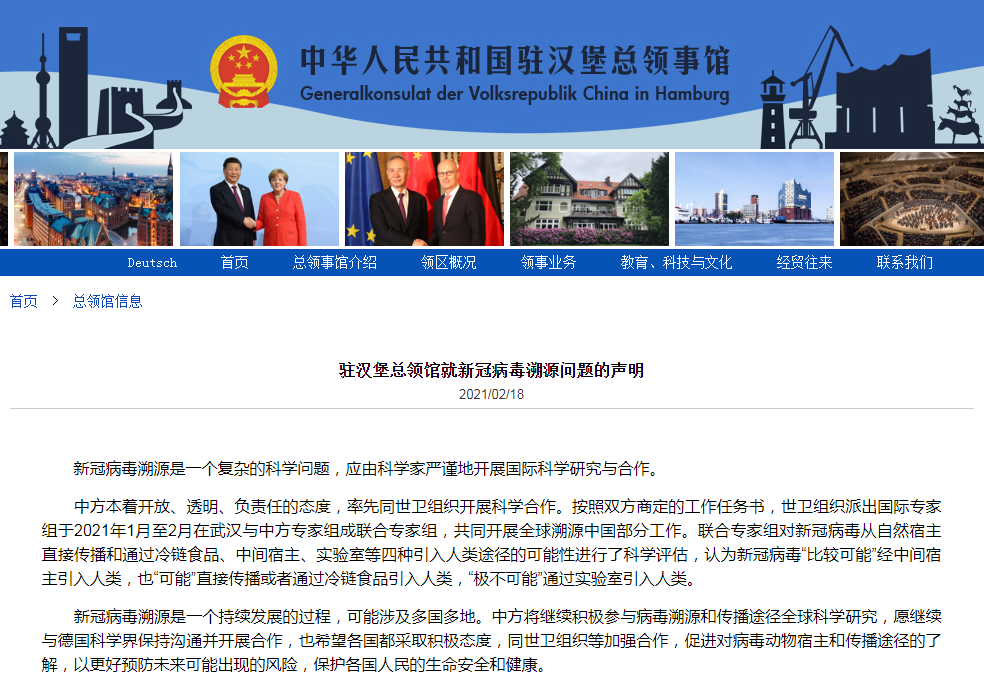 值得注意的是,今年2月,中国驻汉堡总领馆在官方网站上也就新冠病毒溯源问题发表一份重要声明。声明表示,“新冠病毒溯源是一个持续发展的过程,可能涉及多国多地。”