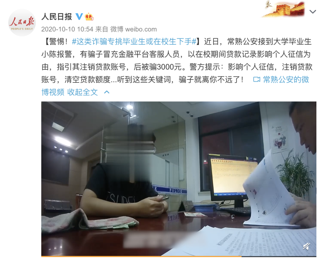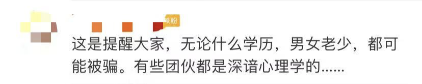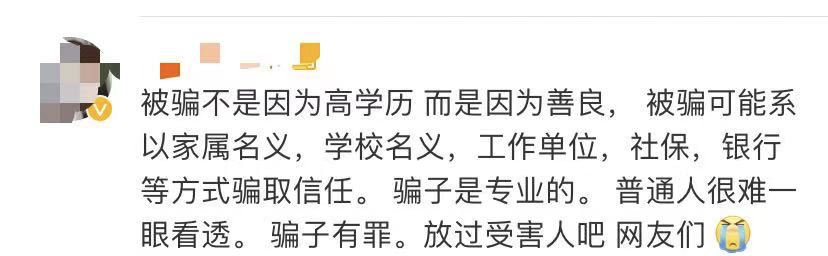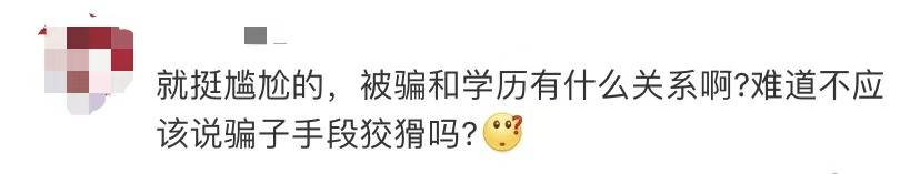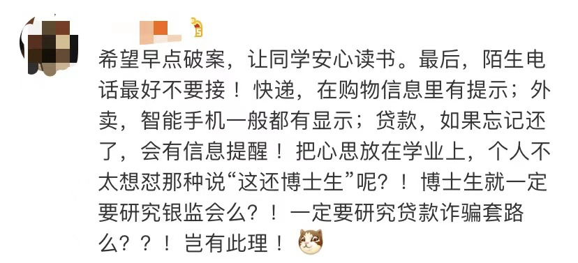 | 一则落款为武汉市公安局铁箕山派出所的《警情通报》显示,中南财经政法大学一博士生接到自称是银监会工作人员电话后,于3月8日13时至15时之间将贷款金额共计10万余元分多次转入对方提供的账户,意识被骗后,随即报警。 3月9日下午,记者从铁箕山派出所了解到,上述《警情通报》确系该所发出。 但该《警情通报》在网络流传后,有部分网友发出疑问:“博士生也被骗?是法学博士吗?” 对此,中南财经政法大学研究生院研究生管理办公室工作人员则表示,“每个人都有自己的难处。” 此外,该校党委研究生工作部负责人告诉记者,“学校从新生入学开始,就对学生开展预防诈骗等相关的教育工作。至于这事,考虑到涉及学生隐私和学生情绪等因素,不便就此透露更具体情况。”  而对于网络上的“高学历也被骗”一说,不少网友看不下去了↓ 也有网友暖心提醒:无论学历、年龄,对深谙心理学的诈骗团伙不可大意↓ 值得注意的是,此前,全国多地出现“注销校园贷”骗局,不少在校及刚毕业学生“中招”,被骗金额少则几千,多则几十万。统计结果显示,2020年上半年,监测到涉及“注销校园贷”骗局接近9.3万条。 中消协提示,一定警惕“注销校园贷”骗局,不向陌生账户转账!