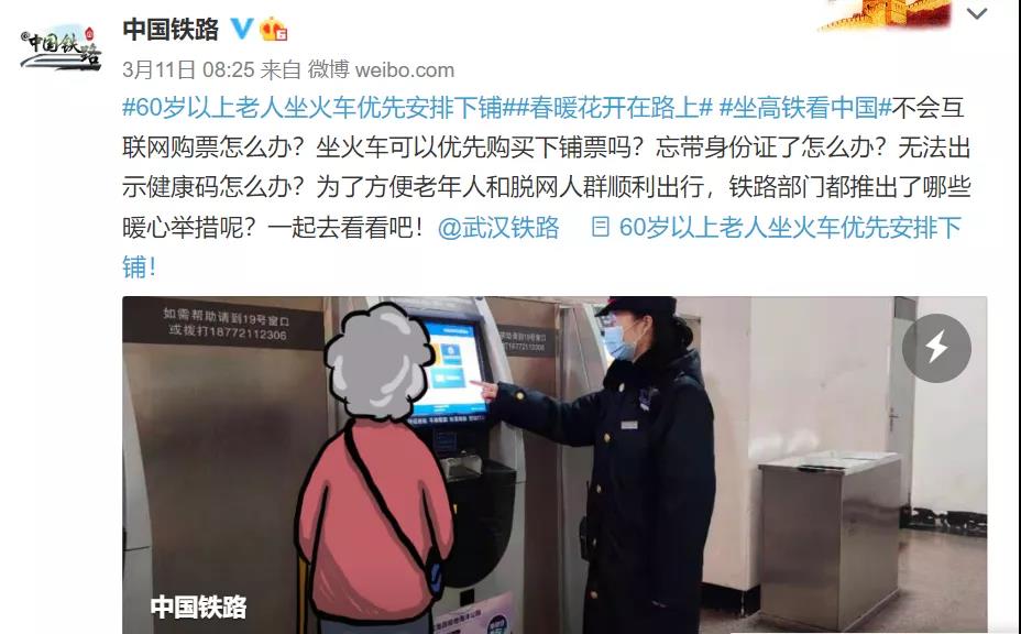 据@中国铁路 11日消息,铁路12306对网络售票系统进行了优化调整,在票量充足的情况下,能自动识别60岁以上的老年旅客并优先安排下铺。如果是多人同行一份订单,系统也会自动分配相邻座位。 日前,全国人大代表,中国国家铁路集团有限公司董事长、党组书记陆东福接受记者专访时指出,铁路部门不断推出电子客票、刷脸核验、在线选座、网上订餐等便民利民措施,落实老年人和脱网人群服务保障措施,使“坐着高铁看中国”成为百姓出行的真实写照。 铁路12306对网络售票系统进行了优化调整,在票量充足的情况下,能自动识别60岁以上的老年旅客并优先安排下铺。如果是多人同行一份订单,系统也会自动分配相邻座位。所以,想为老人购买下铺票的朋友,建议提前规划行程,尽早购买火车票。 不用担心!车站依旧保留人工售票窗口,自助机购票还配备人工服务引导,同时,所有人工窗口全部支持现金购票,保障老年旅客购票服务。 部分车站还设置了爱心窗口,可优先为老年旅客办理现金购票、改签等业务。 进站乘车时,将身份证放在闸机上,摘下口罩进行人脸识别,经身份核验,闸机打开后方可通过。同时,车站均设有人工验证口,老年旅客也可选择通过人工验证乘车。 可以在车站的公安制证窗口或自助制证机办理临时身份证明,然后通过人工检票口进站乘车。注意:临时身份证明仅限当日乘车使用。 对于无法出示健康码的旅客,可以持有效身份证件至人工登记处进行登记,经过登记查验后方可出站。 同时,铁路部门在车站设置了超醒目的提示牌,走“无健康码专用通道”以上问题都可解决。 可以通过铁路12306APP、铁路12306客服电话、铁路12306微信公众号或小程序以及车站的爱心电话,预约重点旅客服务。车站工作人员接到预约后,会根据老年旅客出行日期、车次、具体需求提供轮椅等“定制化”接送站服务。 车站均设有重点旅客候车室(区),老幼病残孕等重点旅客均可在专门的区域候车,优先检票乘车。对于行动不便需要帮助的旅客,车站会有工作人员进行帮扶,送至列车,并与列车长办理交接。 家属如果想送老年旅客进站,可以通过铁路12306APP、电话预约等方式,或直接前往车站的服务台办理爱心卡进行送站。一定要携带好有效证件! 乘务员通过手持终端系统可以掌握所有旅客的乘车信息。无论白天还是黑夜,他们都会在列车到站前15至30分钟内提醒您,老年旅客不用担心坐过站。 现场购票的老年旅客可以通过人工窗口打印的行程信息提示单查看乘车信息。网络购票的旅客可通过铁路12306APP或绑定的微信、支付宝接收通知查看行程信息。另外,在进站口、列车上也可以通过询问工作人员,查询到自己的座位信息。 旅客可通过铁路12306官网订餐平台、12306APP等方式订餐,可预订所乘列车餐车供应餐食,也可预订沿途供餐站点供应的社会品牌餐食。铁路站车服务人员将通过订单小票信息、订餐手机号码核验旅客身份送餐。 老年旅客也可以前往餐车,向工作人员咨询餐车配餐情况。旅客选好餐食种类,工作人员进行用餐时间和座位号码登记并送到旅客座位上。