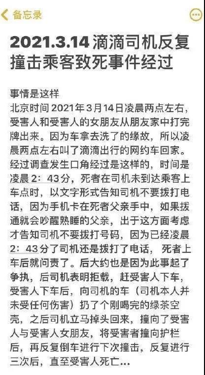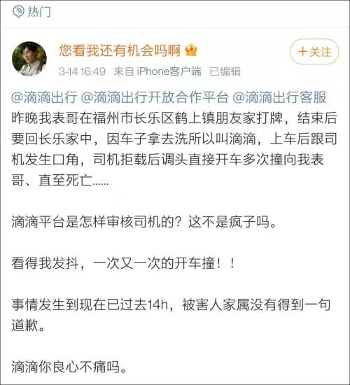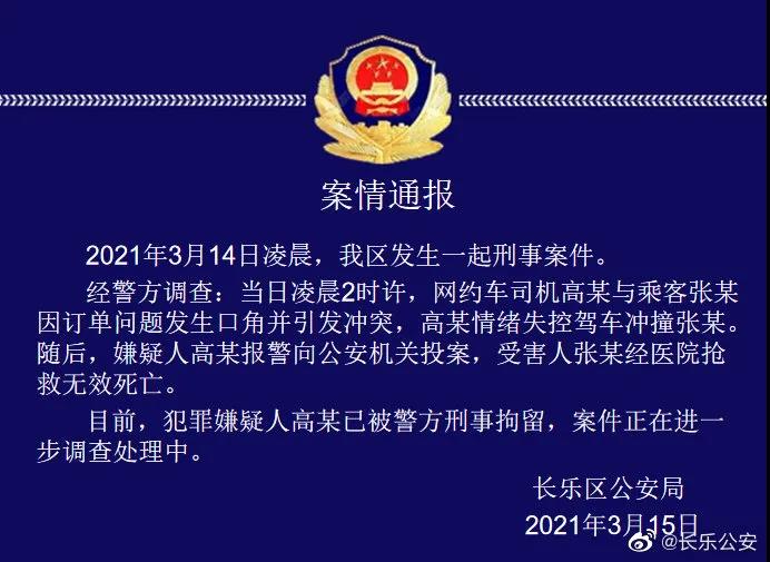 3月14日,网友杨珊(化名)发帖称,14日凌晨,其表哥在福建福州长乐区鹤上镇打滴滴网约车回家,上车后因发生口角被司机拒载,其表哥向司机的车扔空饮料瓶后,司机掉头多次撞击其表哥致死。 15日,滴滴官方发布情况通报,称将全力协助死者家属做好善后事宜;福州长乐警方也通报称,犯罪嫌疑人已被警方刑事拘留。 网友发帖:乘客遭司机多次撞击身亡?14日,网友杨珊(化名)发帖讲述事发经过称,14日凌晨2点左右,其表哥及其女友在福州长乐区鹤上镇的朋友家打牌出来,叫了一辆滴滴网约车回家。当时是凌晨两点多,因该乘客的手机卡在其父亲手中,担心司机打电话会吵醒熟睡的父亲,。 司机到达上车地点附近打了电话联系乘客,上车后,该乘客因此责怪司机,双方起了争执后,司机表明拒载,将乘客赶下车。下车后,该乘客将空饮料瓶扔向司机的车,随后,滴滴司机掉头多次撞击该乘客导致其死亡。 对此,滴滴公司客服随后在杨珊发帖评论区回应称,公司非常重视杨珊反馈的情况,需要了解更多信息,已私信与其联系。 14日傍晚,杨珊在评论区称,滴滴官方打电话要求受害者家属删除相关微博。 滴滴回应: 将协助家属做好善后事宜 3月15日,滴滴官方微博@滴滴出行 发布《关于福州快车司机开车冲撞乘客致其身亡的情况通报》。 通报全文 3月14日凌晨2点左右,福州一名滴滴快车司机高某某接到一名男乘客和一名女乘客后,男乘客认为司机夜里打电话影响家人休息,司机认为自己到达订单起点后联系乘客无过错,双方因此发生口角,女乘客及时进行了劝阻但未果,后司机开车连续冲撞男乘客致其身亡。对于这起不幸事件,我们感到万分悲痛和震惊,强烈谴责施暴者的恶劣行为。 事件发生后,我们紧急成立了专项工作组,密切配合警方展开案件调查工作,向警方提供了车内录音、录像及订单行程信息。感谢公安机关迅速破案,目前该司机已被警方控制,必将受到法律严惩。 发生这样的悲剧,我们深感自责。专项工作组于14日当天前往受害者家中看望家属,我们深知施暴者的恶行带给这个家庭巨大的伤害,我们将全力协助家属做好善后事宜。 同时,我们核查了司机的情况,该司机2019年4月通过背景审核(无犯罪记录)后注册为滴滴司机,并取得网络预约出租车汽车驾驶员证,驾龄19年,过往无安全类相关投诉。 我们深知,每一次出发都是一份责任。教训十分惨痛,虽然难以100%杜绝安全事件的发生,但我们一定100%努力扫除每一个安全隐患,加强司机安全培训,降低安全事件的发生概率。我们也恳请每一位司机和乘客,遇到纠纷时多一份理性,司乘之间多一份尊重和包容。 警方通报: 涉事司机已被警方刑事拘留 3月15日,福州长乐区警方发布案情通报称,3月14日凌晨,福建长乐区发生一起刑事案件。经调查:当日凌晨2时许,网约车司机高某与乘客张某因订单问题发生口角并引发冲突,高某情绪失控驾车冲撞张某。随后,嫌疑人高某报警向公安机关投案,受害人张某经抢救无效死亡。 目前,犯罪嫌疑人高某已被警方刑事拘留,案件正在进一步调查处理中。 以上图文均来源于羊城晚报、综合正观新闻、@滴滴出行、长乐公安,版权归原作者所有,转载目的在于传递更多信息,并不代表本号赞同其观点和对其真实性负责。如涉及作品内容、版权和其它问题,请在后台联系微信,我们将在第一时间删除内容! |
