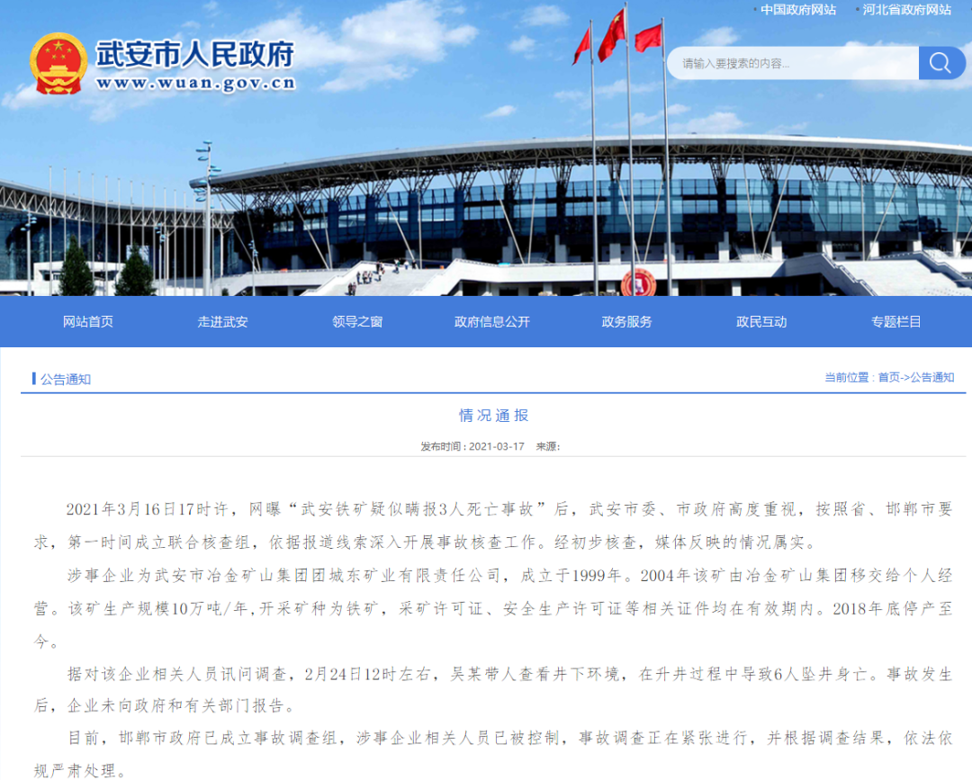 | 2021年3月16日17时许,网曝“河北武安铁矿疑似瞒报3人死亡事故”后,武安市委、市政府高度重视,按照河北省、邯郸市要求,第一时间成立联合核查组,依据报道线索深入开展事故核查工作。经初步核查,媒体反映的情况属实。 涉事企业为武安市冶金矿山集团团城东矿业有限责任公司,成立于1999年。2004年该矿由冶金矿山集团移交给个人经营。该矿生产规模10万吨/年,开采矿种为铁矿,采矿许可证、安全生产许可证等相关证件均在有效期内。2018年底停产至今。 据对该企业相关人员讯问调查,2月24日12时左右,吴某带人查看井下环境,在升井过程中导致6人坠井身亡。事故发生后,企业未向政府和有关部门报告。 目前,邯郸市政府已成立事故调查组,涉事企业相关人员已被控制,事故调查正在紧张进行,并根据调查结果,依法依规严肃处理。