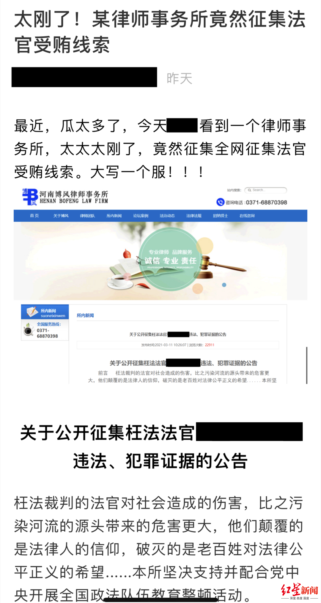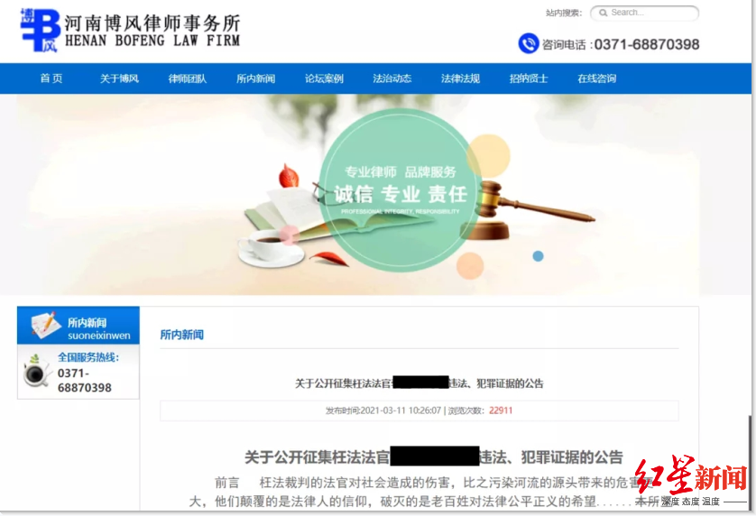 : 3月17日,某个人微信公众号发布题为《太刚了!某律师事务所竟然征集法官受贿线索》的自媒体文章,文内附有一张河南博风律师事务所(以下简称“博风律所”)网站的截图,截图显示,该律所发布公告“公开征集枉法法官 ...