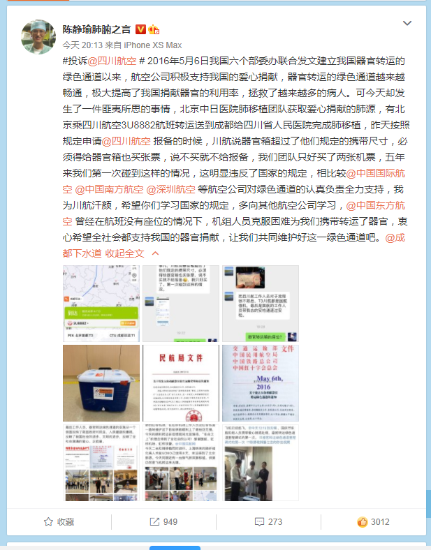 3月19日晚,微博认证为“无锡市人民医院副院长”的微博用户@陈静瑜肺腑之言 发文称,有肺移植团队在转移肺源时,按照规定向四川航空报备,但川航认为,器官箱超过了规定的携带尺寸,必须得给器官箱也买张机票。 3月20日,四川航空的相关负责人回应:双方达成一致,退还占座费用,也取得了旅客谅解。 医生称器官转运需另购机票 记者注意到,原国家卫生计生委等六部门于2016年5月发布的《关于建立人体捐献器官转运绿色通道的通知》要求,OPO工作人员在明确获取人体捐献器官时间后,根据实际需要,航空运输时应当将航班班次通过航空公司客服电话直接向其通报,铁路运输时应当将火车车次等信息通过人体捐献器官转运绿色通道24小时应急电话向有关单位通报。公路运输时应当优先使用救护车运输,经过收费公路收费站时可优先通过。到达机场、车站后,OPO工作人员优先办理乘机、乘车手续,并优先通过安全检查,实现快速登机或乘车。 通关时,OPO工作人员应当携带移植中心器官接收确认书,人体捐献器官运输箱应当在箱外显著位置张贴人体器官运输专用标志。检查人员认为有必要的,可拨打国家卫生计生委人体捐献器官转运绿色通道24小时应急电话查验相关信息,并留存移植中心器官接收确认书副本。人体捐献器官运输箱应当接受X射线行李安检仪器设备的检查,无疑点的可不再进行开箱检查。器官运输箱内含有航空、铁路部门禁止或限制携带物品的,应当事先取得航空、铁路部门的同意;含有保存人体捐献器官所必须的液态物品的,不受液态物品航空、铁路运输条件的限制,但均应满足存储和运输安全要求。OPO工作人员及其行李物品(人体捐献器官运输箱除外)按照正常程序接受民航、铁路安全检查。 现有规定中,对人体器官转运箱的尺寸和超出尺寸是否需要另外购买机票等,未给出明确规定。 川航回应:退还占座费用 3月20日,记者联系了四川航空的相关负责人,对方表示,该旅客携带的人体器官的容器,超过了公司旅客手提行李的最大尺寸,按照现行业务规定,(当时)工作人员按占座行李的方式来办理。 “昨晚我们的工作人员已和旅客取得了联系,出于人道主义角度考虑,我们会为他的占座行李办理退款。这个处置是双方达成一致,也取得了旅客谅解。”该负责人称。 同时,川航方面介绍,在航班保障上,由于考虑到人体器官运输的特殊性,机组进行了积极协调,申请优先落地,所以这个航班比计划时间提前了20分钟落地 来源于澎湃新闻、红星新闻、广州日报,转载目的在于传递更多信息,并不代表本网站赞同其观点和对其真实性负责。如涉及作品内容、版权和其它问题,请在后台联系微信,我们将在第一时间删除内容! |