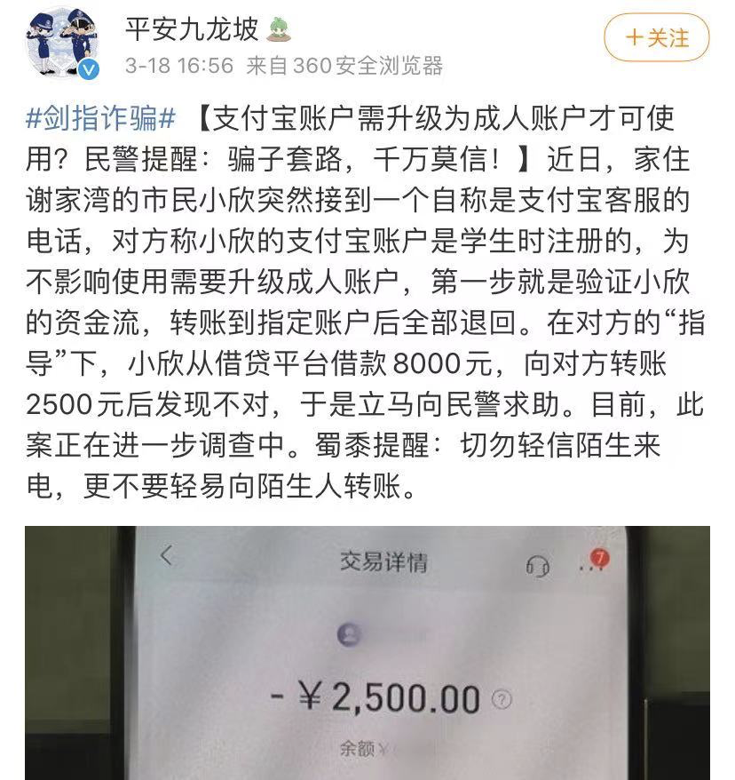 3月17日,银保监会等部门联合发布通知,禁止小贷公司向大学生发放互联网消费贷款。 然而近日,多位在校大学生称近期有不法诈骗分子装作银监会工作人员或网贷公司客服,以“国家禁止大学生网贷,需要把‘学生账户’升级为‘成人账户’”为由,诱导大学生在支付宝借呗等渠道贷款并向其转账。 记者了解到,目前已有多位在校大学生上当受骗,涉案金额从1500至10000元不等。 异地来电自称支付宝工作人员 据报道,3月19日下午,某高校毕业生小王向记者爆料,有一名自称“支付宝工作人员”的人打电话告诉他,其大学生网贷出了问题,需要加一下工作人员的QQ号以帮助解决,否则将影响到个人征信。 对方准确说出了他的学校及姓名,小王被拉进一个“银监会监督管理群”,群里除了该工作人员外,还有一个昵称为“银监会监控中心”的账号。 “支付宝工作人员”指挥小王打开支付宝账号查询借呗余额,然而小王并没有开通过借呗账号,该工作人员却一直表示必须点进借呗才能继续下一步操作。 根据小王提供的聊天截图显示,“支付宝工作人员”共向小王发起了3次语音通话。期间没有发过文字或图片消息,点击举报按钮后都无法选取聊天记录举报。 多名大学生被骗 记者搜索发现,目前已有不少大学生发帖讲诉类似经历。 @平安九龙坡 也曾发布市民被骗经历,并提醒切勿轻信陌生来电↓ 支付宝:不存在学生账户改成人账户情况 记者联系到支付宝官方客服工作人员,工作人员告诉记者:“支付宝都是通过身份证实名认证的,不存在学生账户改成成人账户的情况,对方应该是骗子。” 支付宝官方客服还表示,此前已有其他用户来电反馈过类似被骗经历,支付宝只有一个官方电话95188,不会用私人号码或者添加QQ、微信等联系用户,更不会让用户添加QQ群。 此前,国家反诈中心、中消协等也曾提示,一定警惕“注销校园贷”骗局,不向陌生账户转账! 擦亮眼睛,防止被骗! 来源于中国青年报综合、中国经济网,转载目的在于传递更多信息,并不代表本网站赞同其观点和对其真实性负责。如涉及作品内容、版权和其它问题,请在后台联系微信,我们将在第一时间删除内容! 加入大湾区资讯群 请扫下方二维码 |