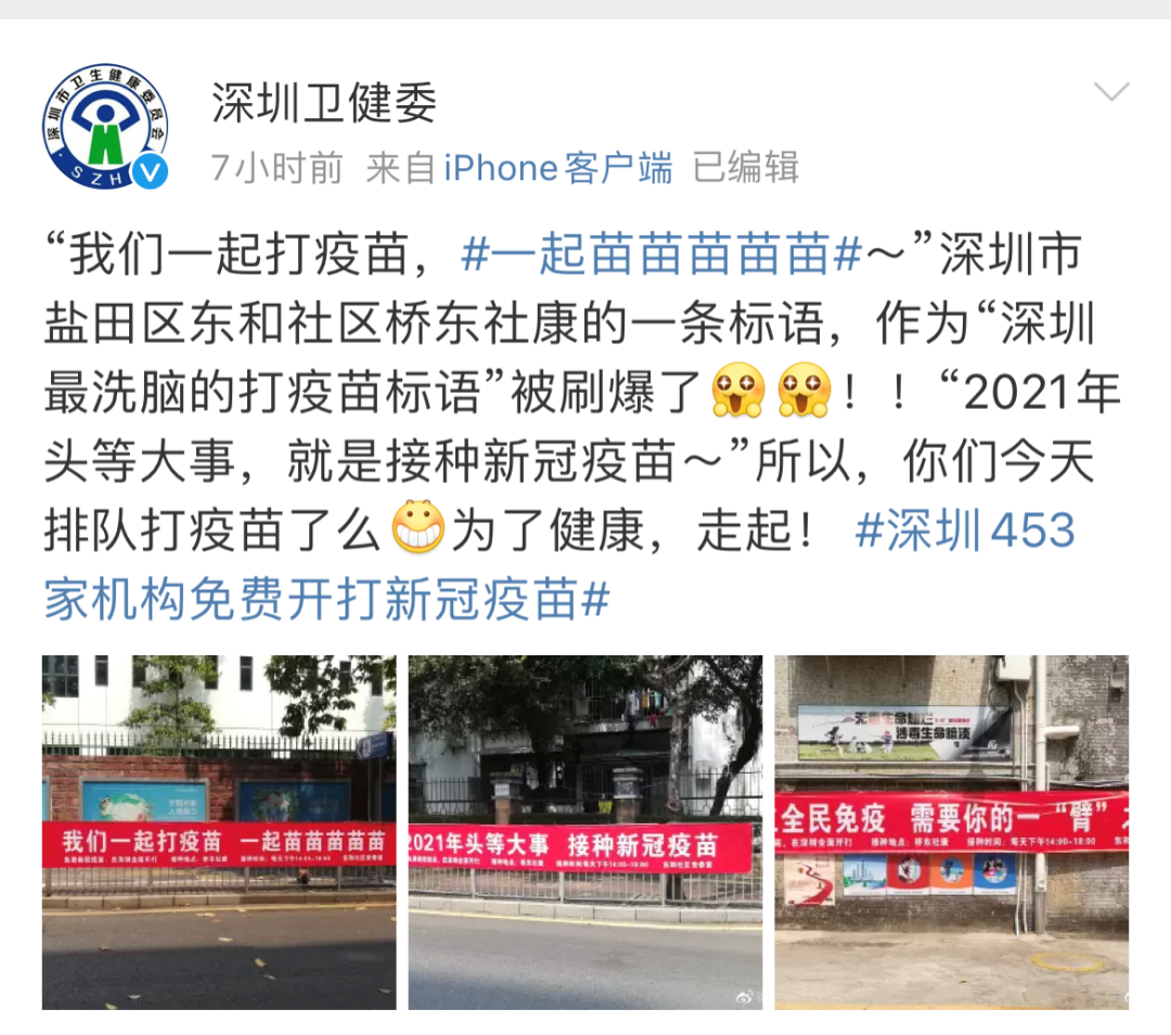 网友们还发现这些自带BGM的标语: 使徒子:我们一起打疫苗/一起苗苗苗苗苗/在你胳膊擦点药/哎呦苗苗苗苗苗/大家全都打疫苗/疫情再也别想闹/你爱我就打疫苗苗苗苗 虎爷两手抓:每个人的身上都有苗苗 玉山蓝:每个人都该打苗苗,跟我一起打苗苗? 有一米八:和所有的病毒说拜拜,和所有的疫苗say嗨嗨 夏小绎seven:你不说爱我我就苗苗苗 陇南司法:哈哈……该出手时就出手,风风火火打疫苗! 深圳无爱的围脖 :哈哈哈,我们一起打疫苗,一起苗苗苗苗苗!我17号就积极响应全民免疫号召,在小区门口的社康中心接种疫苗啦! 呼噜噜的猫咪 : 今天刚苗苗苗苗苗苗 玖蘭不再 : 苗苗,已打 judyshin:已经苗了 今天(29日)首版新冠疫苗接种指南来了《指南》明确提出了相应的建议:如果在接种后怀孕或在未知怀孕的情况下接种了疫苗,基于对上述疫苗安全性的理解,不推荐仅因接种新冠病毒疫苗而采取特别医学措施(如终止妊娠),建议做好孕期检查和随访。对于有备孕计划的女性,不必仅因接种新冠病毒疫苗而延迟怀孕计划。