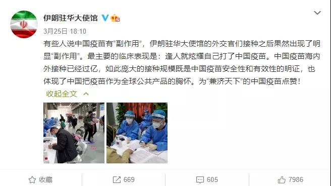 : 近日,@伊朗驻华大使馆发了一条“凡尔赛”微博引发网友热议有些人说中国疫苗有“副作用”伊朗驻华大使馆的外交官们接种之后果然出现了明显“副作用”最主要的临床表现是逢人就炫耀自己打了中国疫苗看了伊朗外交官的 ...