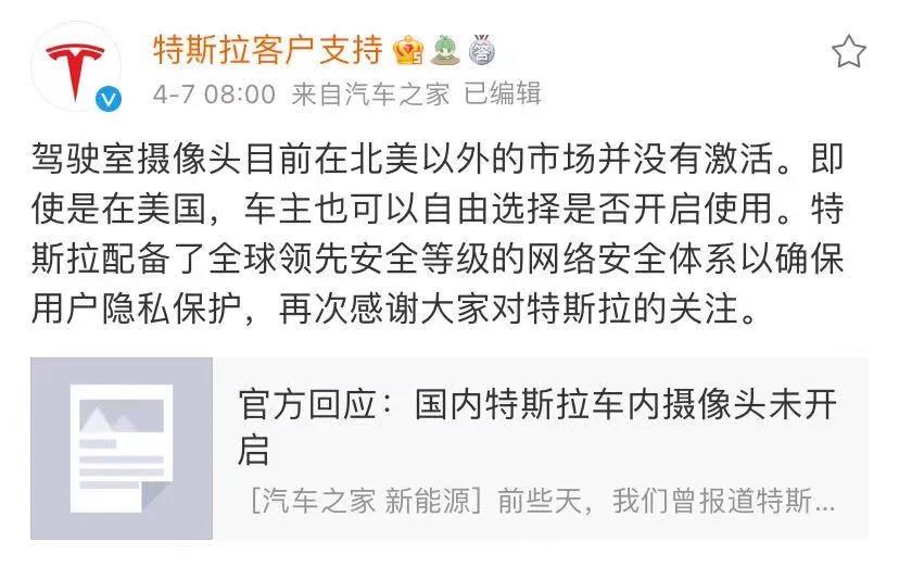 | 近日,特斯拉车内摄像头拍摄高清画面再度引发舆论热议。在社交媒体上,一名被称为特斯拉黑客大神的“绿神”为了查看车内摄像头的监控效果,提取到特斯拉车内摄像头的拍摄画面,分享了两段白天和夜晚的拍摄效果。从视频中可以看出,白天车内摄像头纪录的视频画面,清晰度和色彩丰富度都超出不少人的预期,车内人员乘坐情况基本上都能够查看得一清二楚。 4月7日,“特斯拉客户支持”微博发文回应称,驾驶室摄像头目前在北美以外的市场并没有激活。即使是在美国,车主也可以自由选择是否开启使用。特斯拉配备了全球领先安全等级的网络安全体系以确保用户隐私保护。 新华微评6日就此事评论称,车内安装摄像头或许客观上在保证驾驶人和车辆安全等方面可以带来不少便利,但无论是什么程度的便利,都绝不能以随意让渡个人隐私和信息为代价。“特斯拉们应该明白,车内涉及到的隐私不是你想采,就能采。”