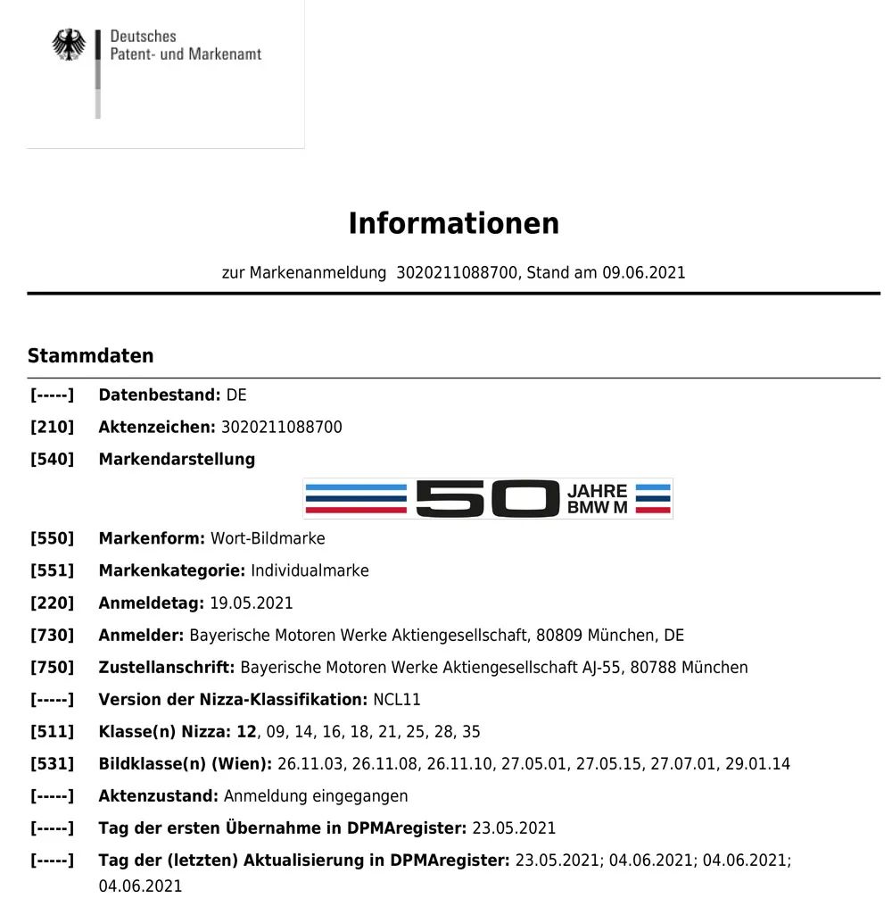 | 2021年5月19日,宝马公司向德国商标局申请注册了一个全新的 「50 JAHRE BMW M(宝马M 50周年)」商标,由于明年将是宝马 M 公司成立50周年,因此新商标或将应用于50周年纪念特别版车型。 新商标继承了宝马M公司熟悉的三色条纹,等距的三条彩色条纹与「50 JAHRE BMW M」文字保持在一个水平位置。三种颜色分别代表了宝马总部巴伐利亚州州旗(蓝),象征宝马与赛车运动的融合(蓝紫)和象征赛车运动的红色。 宝马M公司原称宝马赛车运动公司(BMW Motorsport GmbH),是德国汽车制造业者宝马集团旗下的子公司,最早历史可以回溯至1972年。 原本被称为M部门的该公司本是宝马特别设立用来参与赛车运动的特殊部门,但后来逐渐转变为专事开发原厂高性能车款(M车系)与原厂性能化改装套件的单位。 1992年时宝马将M部门独立而出而设立了子公司BMW Motorsport GmbH,并在隔年将公司名称简化而成为今日的BMW M GmbH。 以上图文均来源于标志情报局,转载目的在于传递更多信息,并不代表本网站赞同其观点和对其真实性负责。如涉及作品内容、版权和其它问题,请在后台联系微信,我们将在第一时间删除内容! |